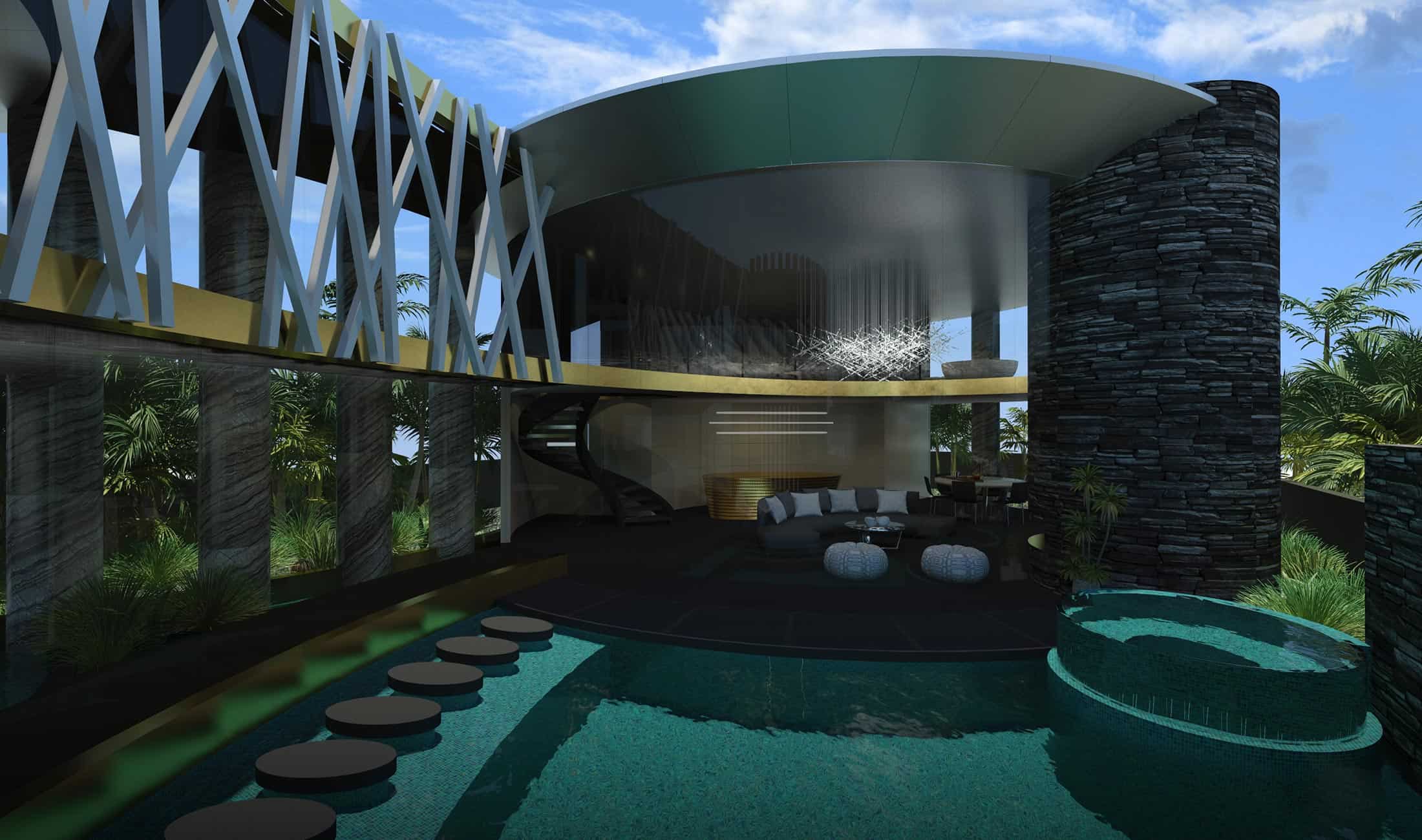 Exploring the nature of curved shapes that fluently link zones, this gold & silver plated stunner sought to step outside the box and into opulent contemporary design that isn’t limited by budget. Chris Clout Design’s luxury representation involves stark elliptical and circular construction where living areas are interconnected seamlessly.