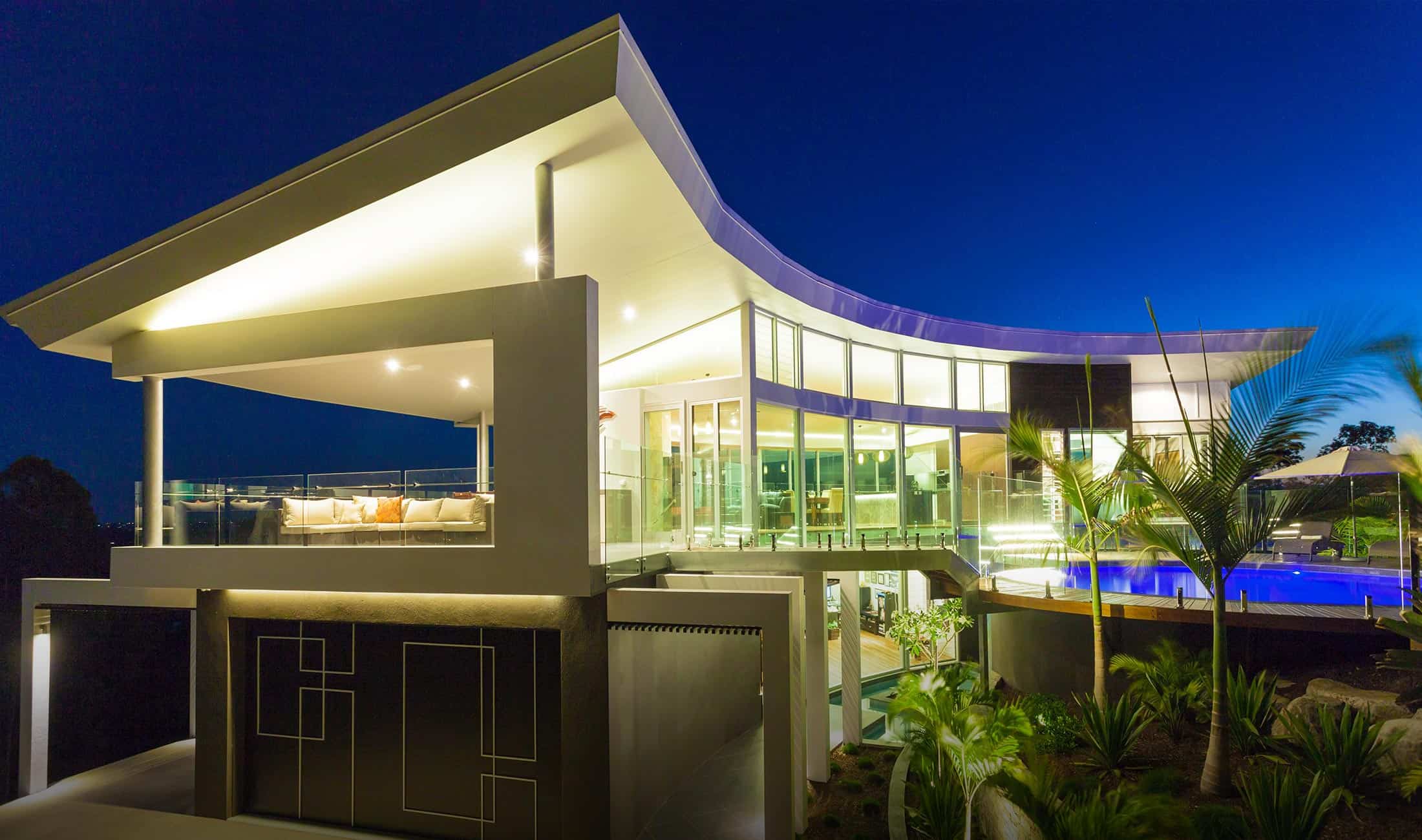 Perched on a hill overlooking the Maroochy River, this design is a mixed oasis which appears to float over its setting. With woodland surroundings and spectacular views encompassing the entire site, there is something beautiful to look at from every point of the house. The double-storey curved void also brings continuity to the house & lets the winter sun permeate the house making the most of its orientation.