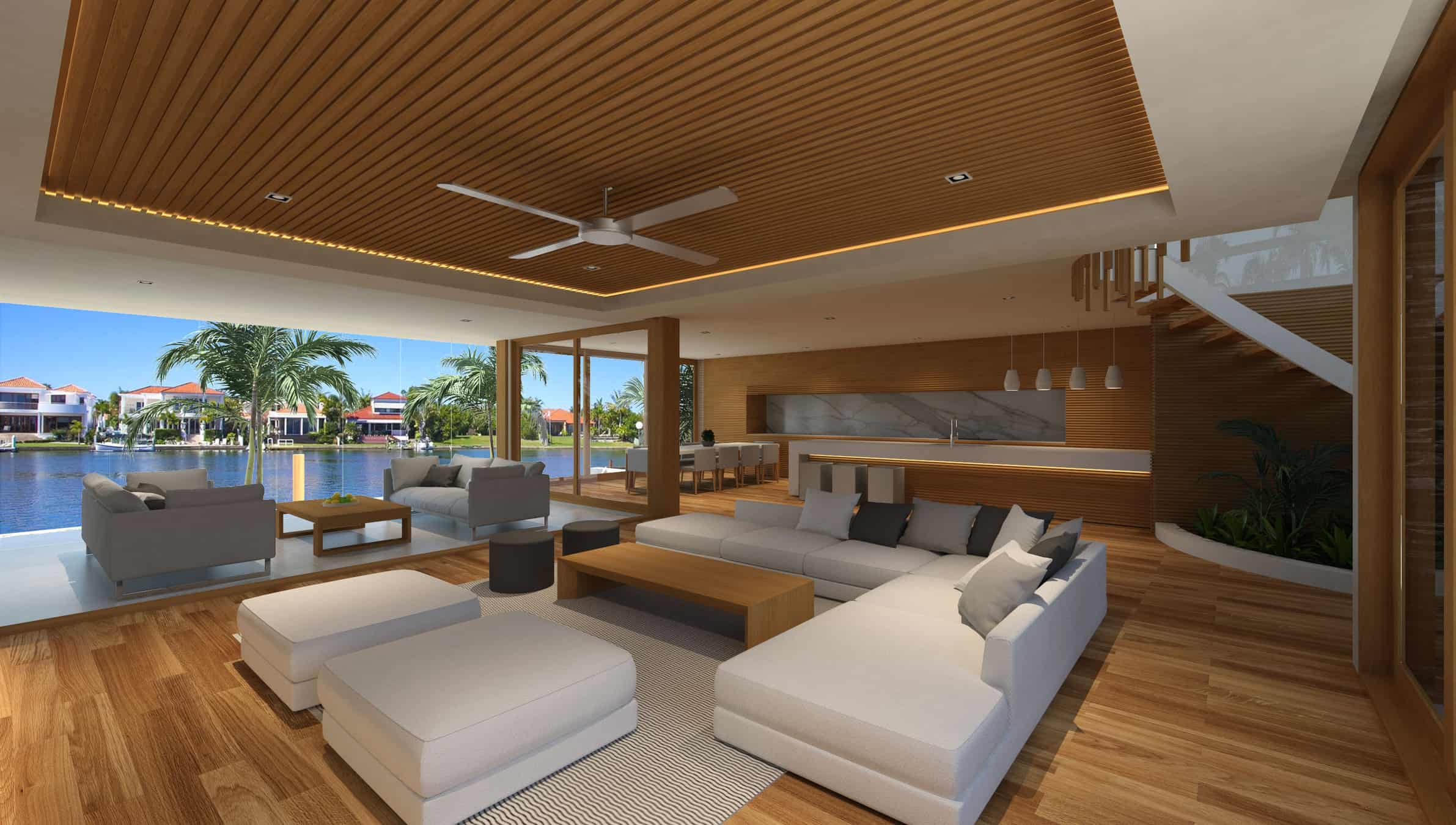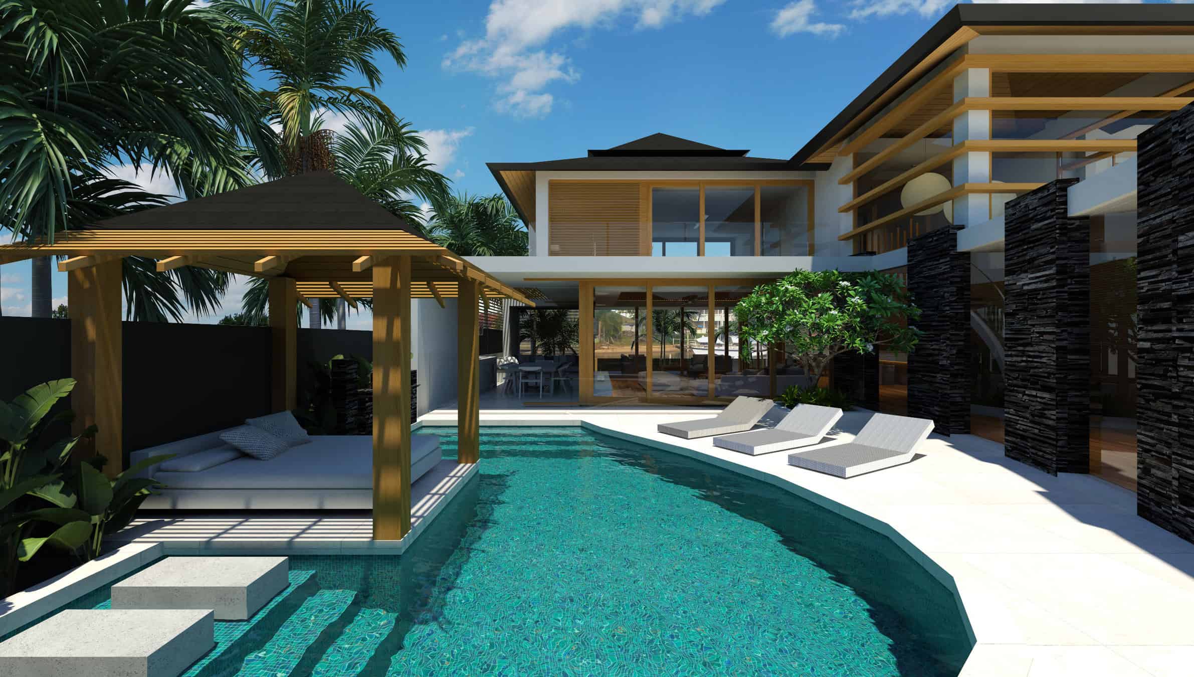 In the gorgeous canals of Minyama, Queensland, this renovation brings resort living to life. With inspiration from the South Pacific, stunning outlooks are provided at every point of the home. Entry ponds and central cabana over the pool provides a private oasis as well as relaxed waterfront views from the canal side.