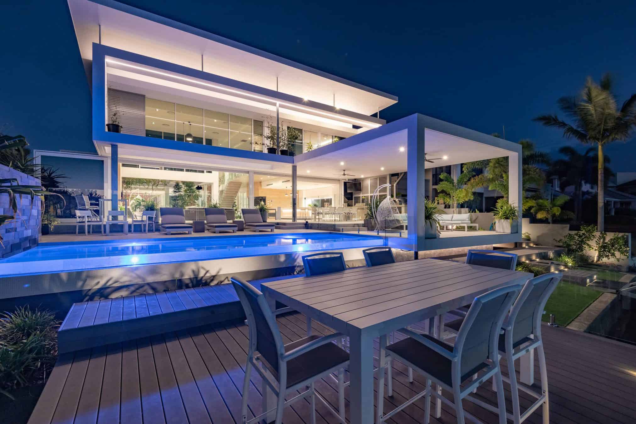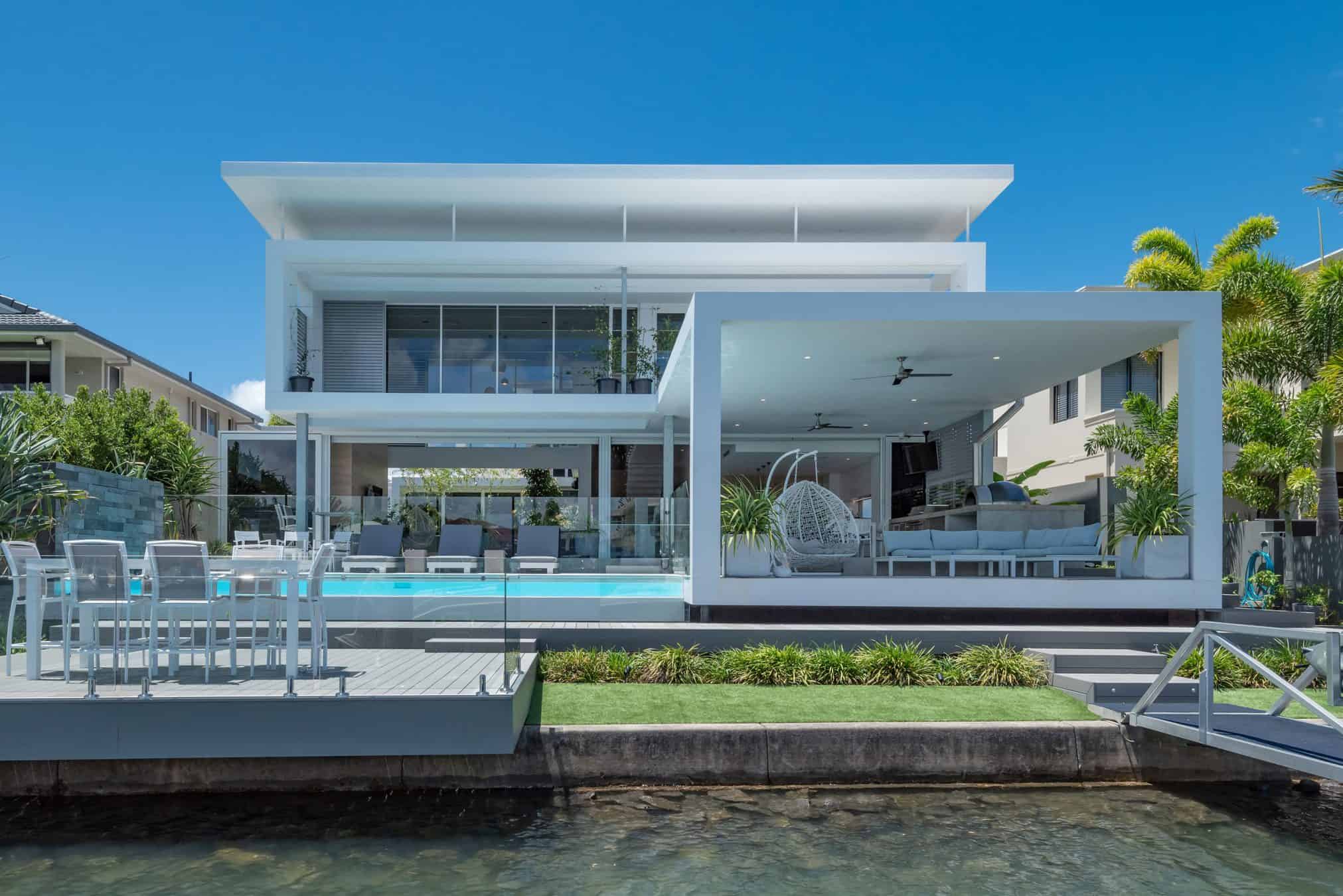 With 180 degree views of the Raby Bay Canal in Queensland, this residence boasts holiday living all-year-round. Natural materials, clean lines and white finishings compliment the surrounding environment whilst native landscaping gives a tropical feel to the residence.