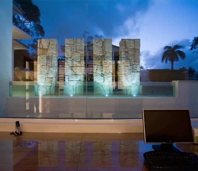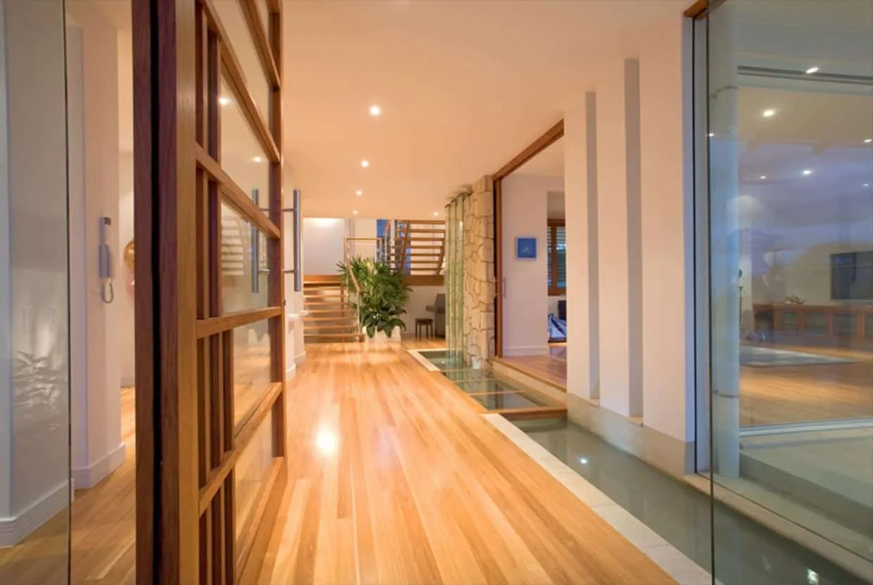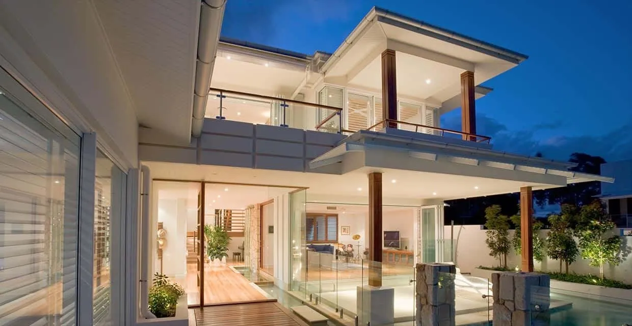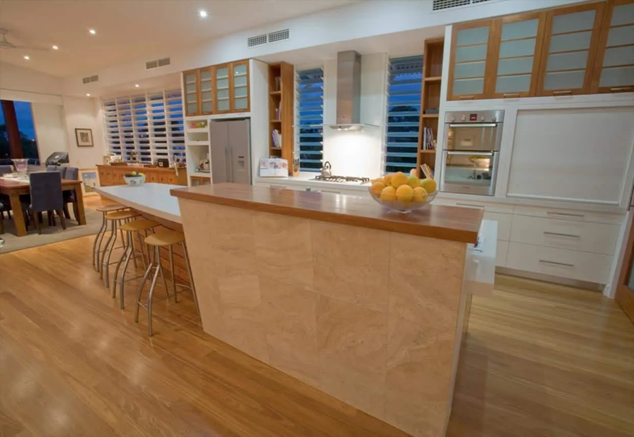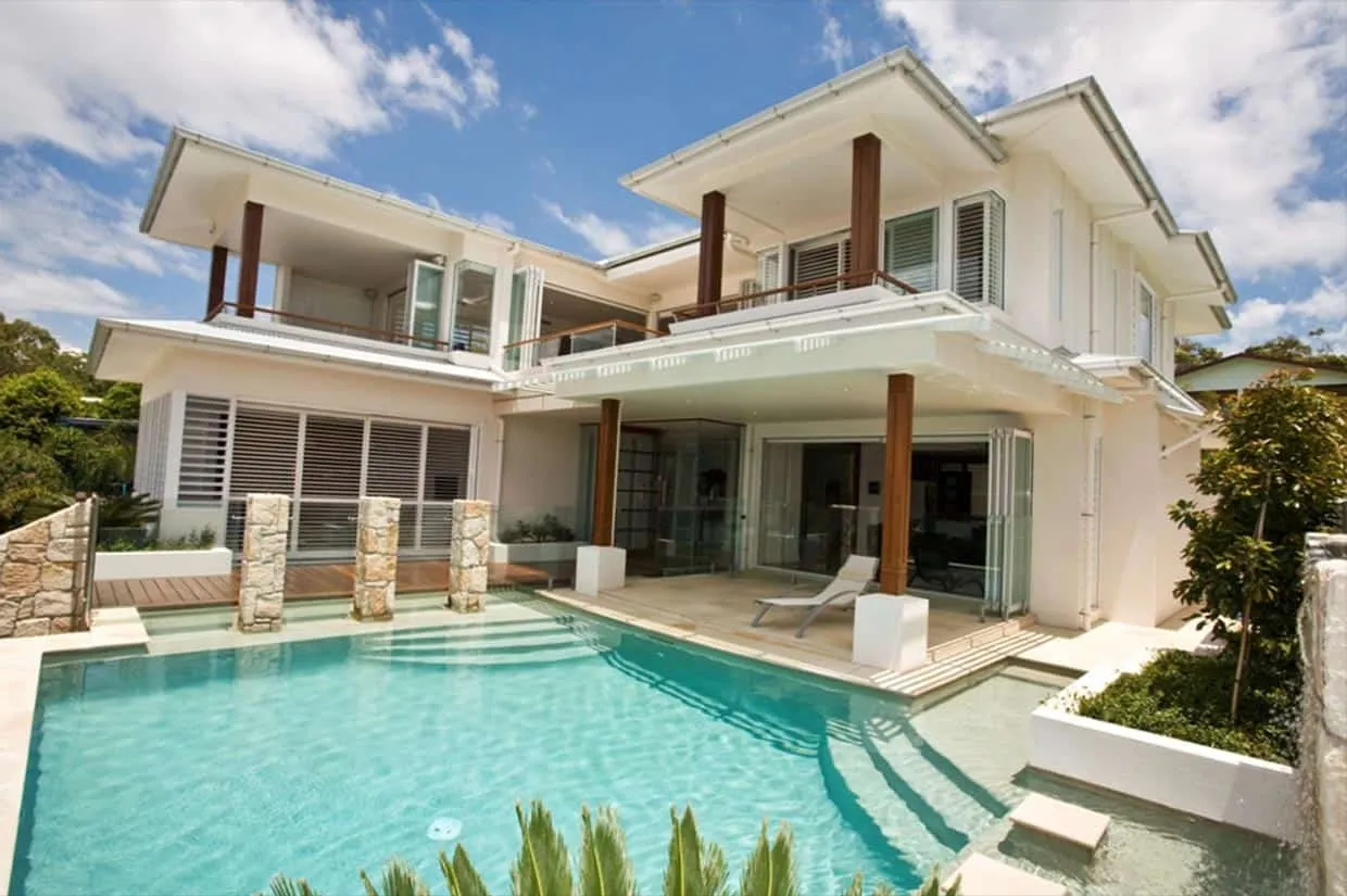 Combining fresh rendered walls with natural sandstone and timber, this regal design has a textured and inviting warmth that starts with the facade and continues through the house. White walls and light timber floors create a classic beach house feel, while the expansive, high roofed open rooms enhance a sense of grand space and freedom.