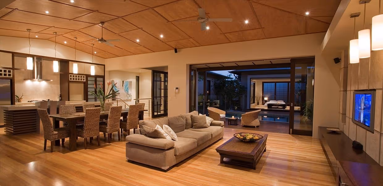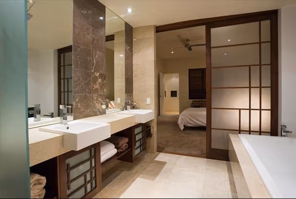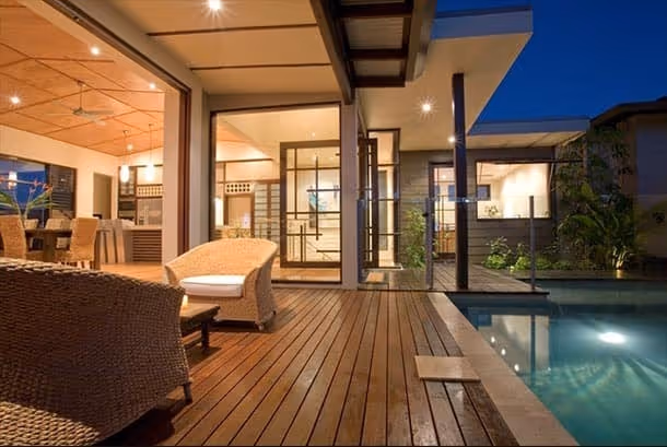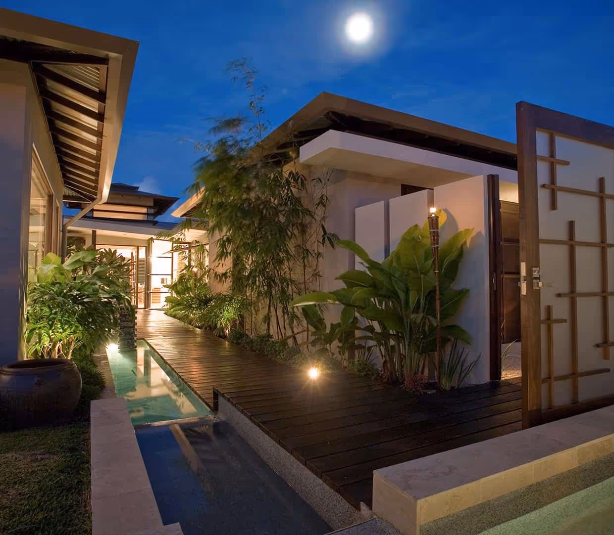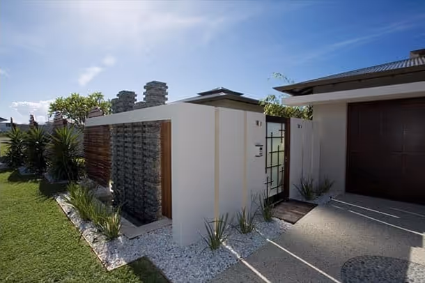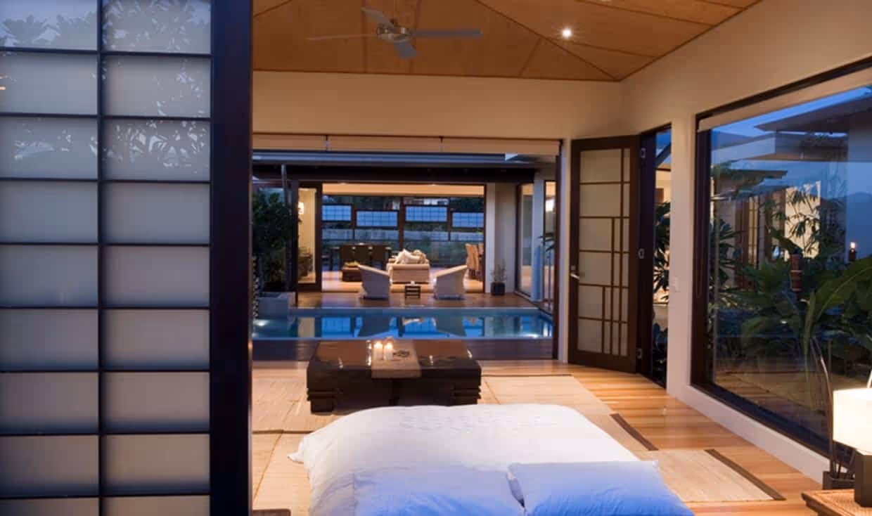 Hidden behind a front fence of round-slat panels and stacked stone, from the street this house appears as a collection of separated pavilions. The home features elevated rooflines articulated in Colorbond steel with custom-made gutters shaped to capture large downpours, all creating a flat-edged flair that accentuates the Japanese-inspired design.
