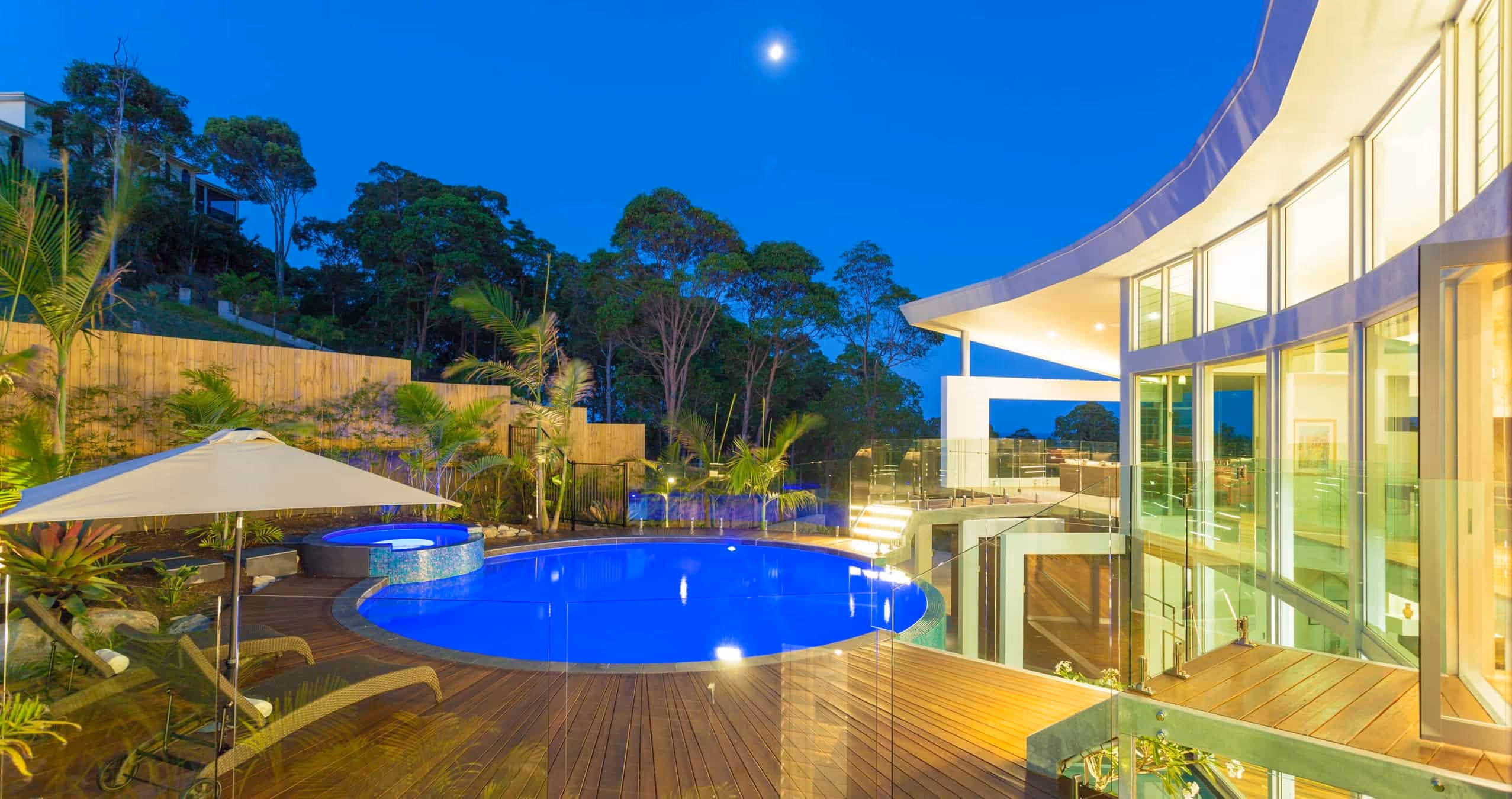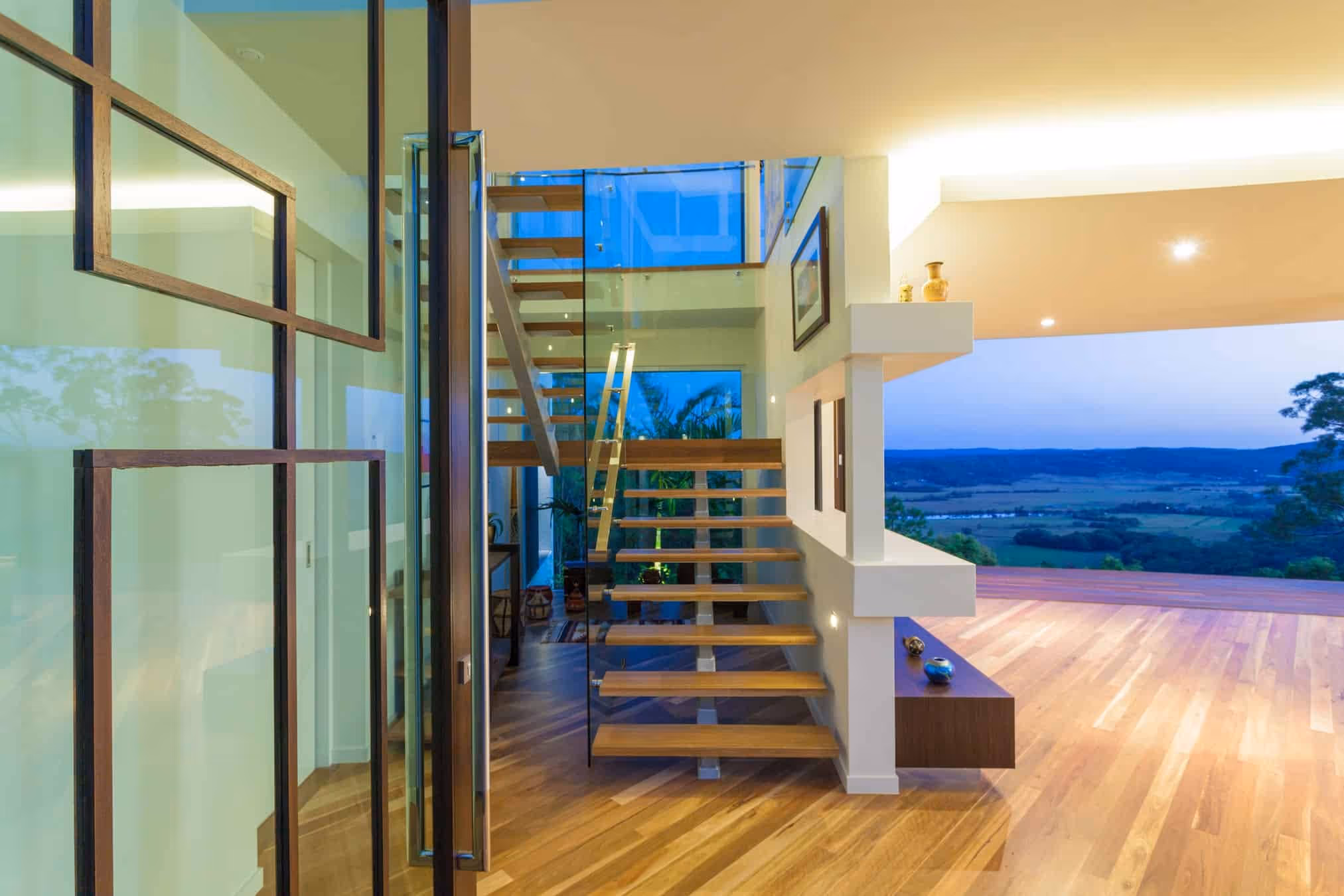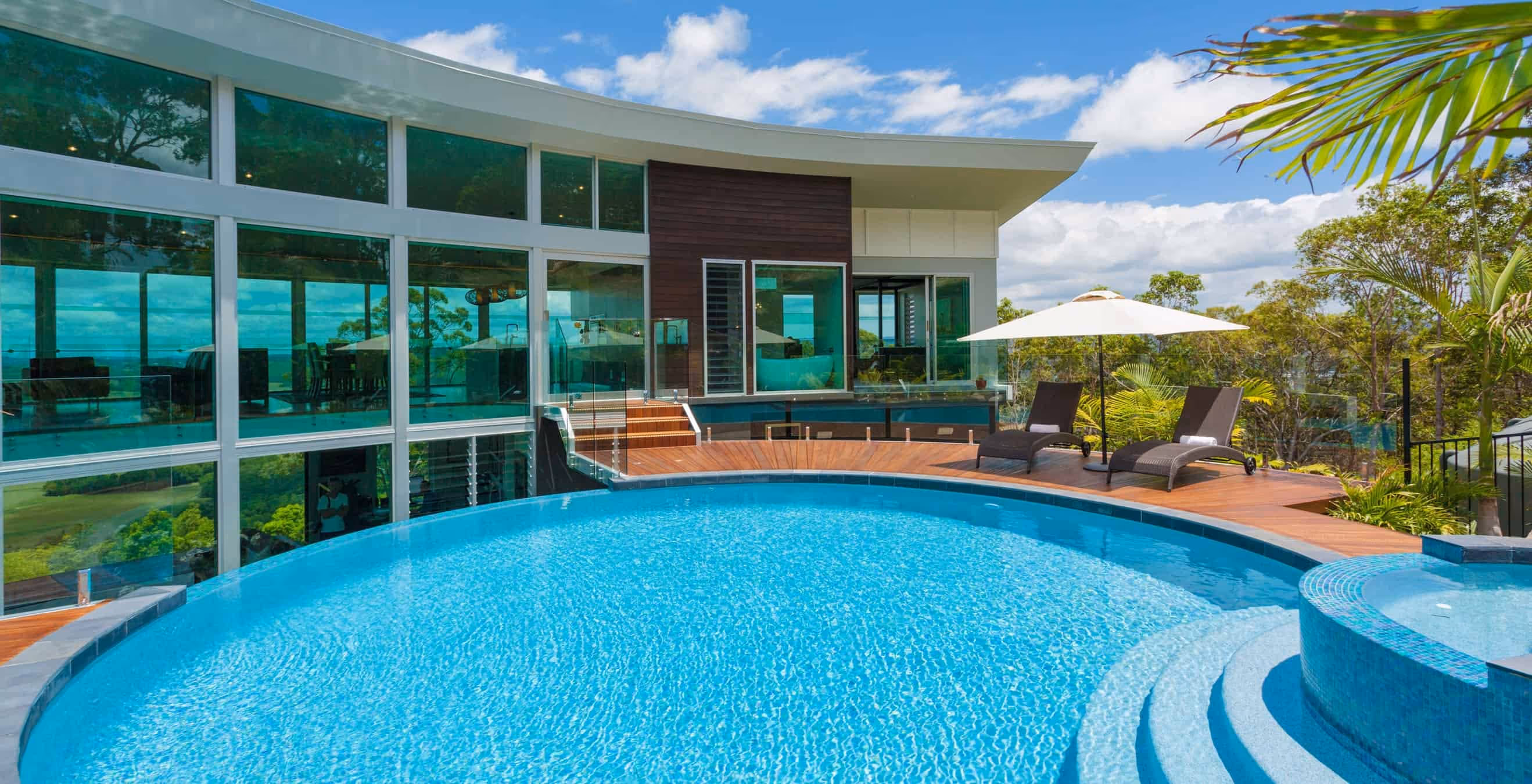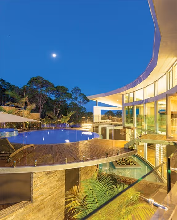Perched on a hill overlooking the Maroochy River, this design is a mixed oasis which appears to float over its setting. With woodland surroundings and spectacular views encompassing the entire site, there is something beautiful to look at from every point of the house. The double-storey curved void also brings continuity to the house & lets the winter sun permeate the house making the most of its orientation.