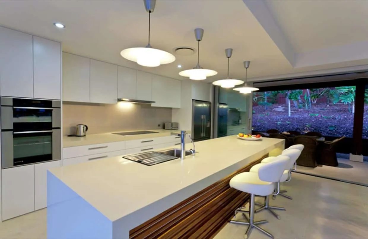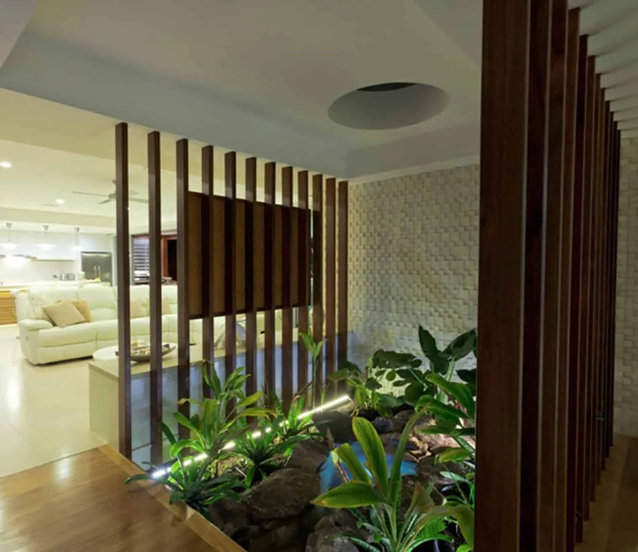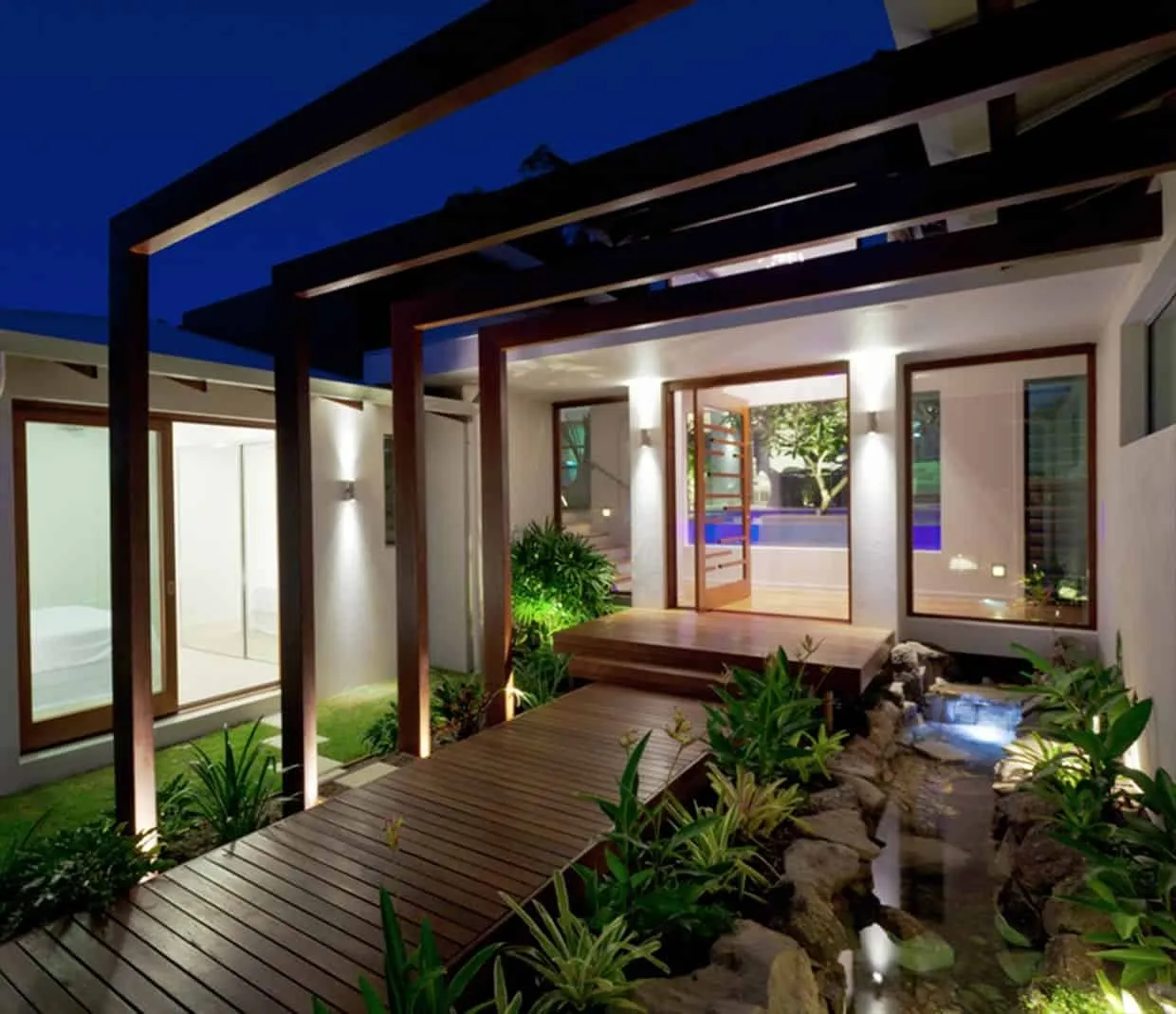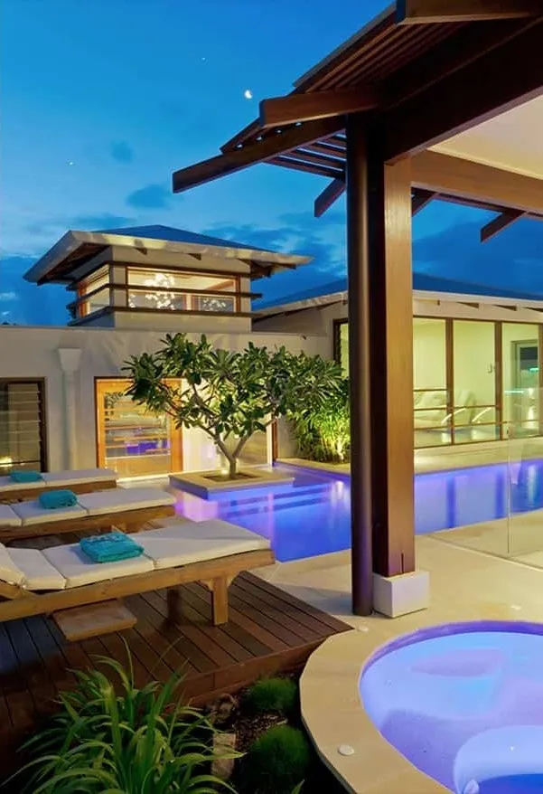 Upon retiring, the owners of this grand home had sought a change of lifestyle. This house, with its blend of natural, simple landscaping and cutting-edge modern design, facilitates this beautifully. Open plan living areas based around the pool blur the space between indoor and outdoor living to create a sense of tropical escape.